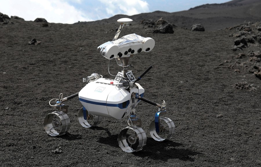 Read moreA robot on the volcanic surface of Mount Etna, Italy, on July 2, 2017. Etna is a test bed for the approximately three-foot high, four-wheeled machine ahead of a future mission to the moon. It is being conducted by the German Aerospace Centre, the agency which runs Germany's space program. #
