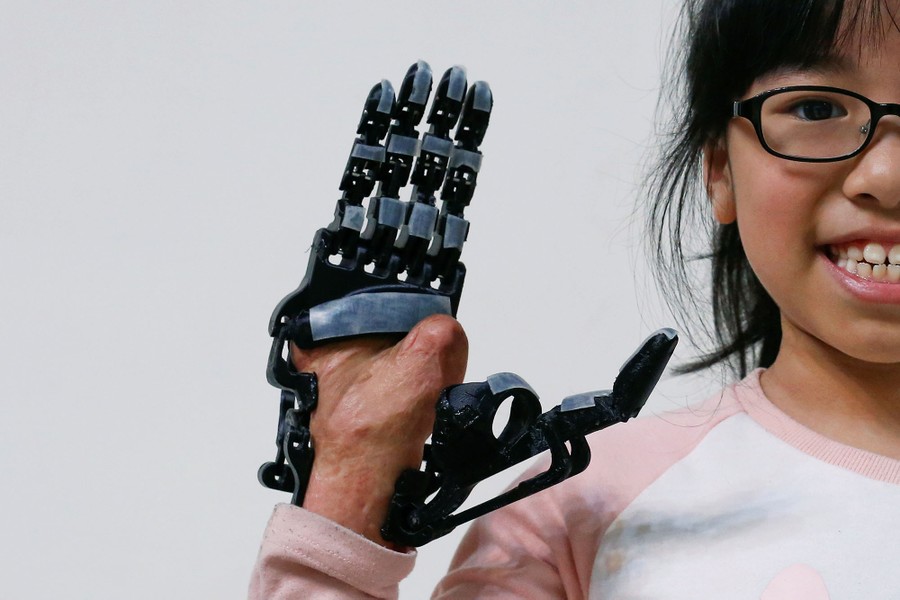Read moreAngel Peng, 8, who injured her hand in a scalding accident when she was nine months old, poses for a photograph wearing a 3D-printed prosthetic hand designed and built by engineer Chang Hsien-Liang, in Taoyuan, Taiwan, on April 6, 2017. #