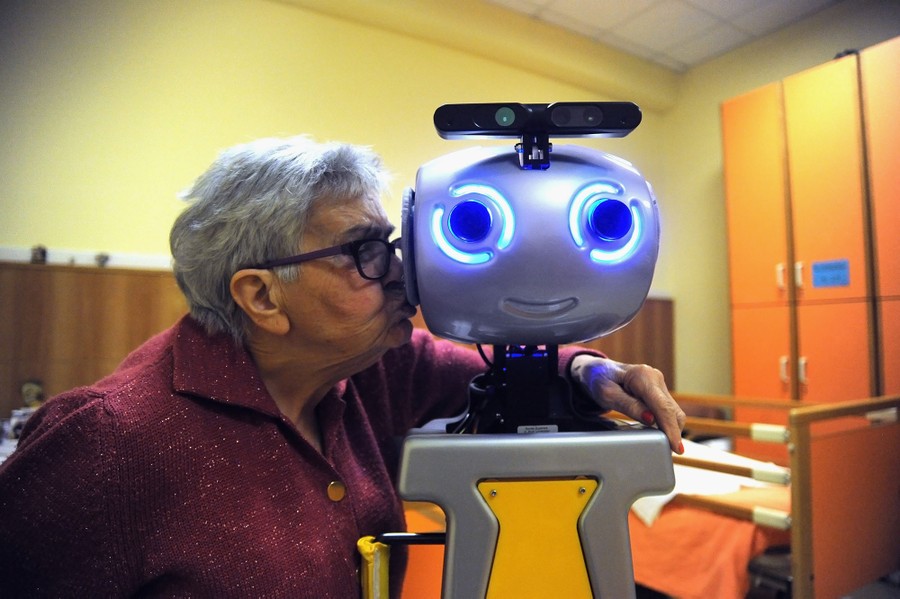 Read moreA woman kisses a robot during daily activities of the project 'Robot-Era' at nursing residence San Lorenzo on December 19, 2015 in Florence, Italy. In the Residenza Sanitaria Assistenziale San Lorenzo ('nursing residence') a robot acts as a perfect caregiver or butler for the 20 elderly guests. The robots are designed and programmed to perform functions in the house, outside and in the condominium. The EU supported project Robot-Era involves 160 people in real-world environments for a duration of 4 years. #