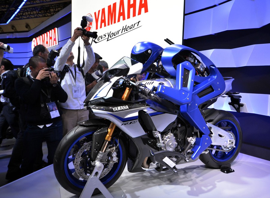 Read moreJapan's motorcycle maker Yamaha introduces a prototype model of a motorcycle riding robot "Motobot" during a press preview at the Tokyo Motor Show in Tokyo on 28, 2015. #