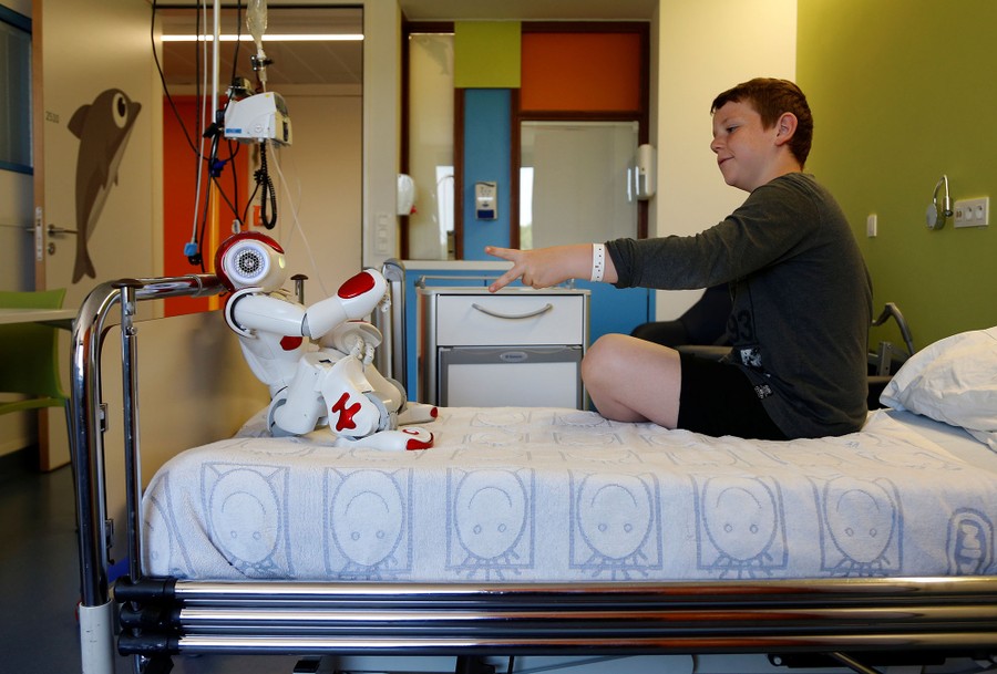 Read moreBelgian Ian Frejean, 11, plays with "Zora" the robot, a humanoid robot designed to entertain patients and to support care providers, at AZ Damiaan hospital in Ostend, Belgium, on June 16, 2016. #