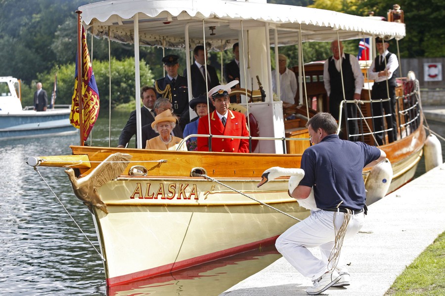 Read moreBritain's Queen Elizabeth II, front left, accompanied by Swan Marker David Barber, front right on the boat, in the steam launch 'Alaska', watches a swan upper place a swan back into the river during a swan upping census on July 20, 2009. #