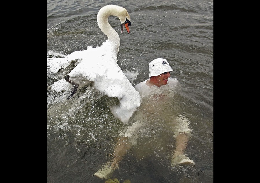 Read moreSwan Uppers use their boats to corral swans to check them during the annual Swan Upping swan count on the River Thames near London, on July 19, 2010. With a flurry of flapping wings and a cacophony of confused squeaking, the swan and her downy young cygnets were plucked from the river and passed from boat to shore. #