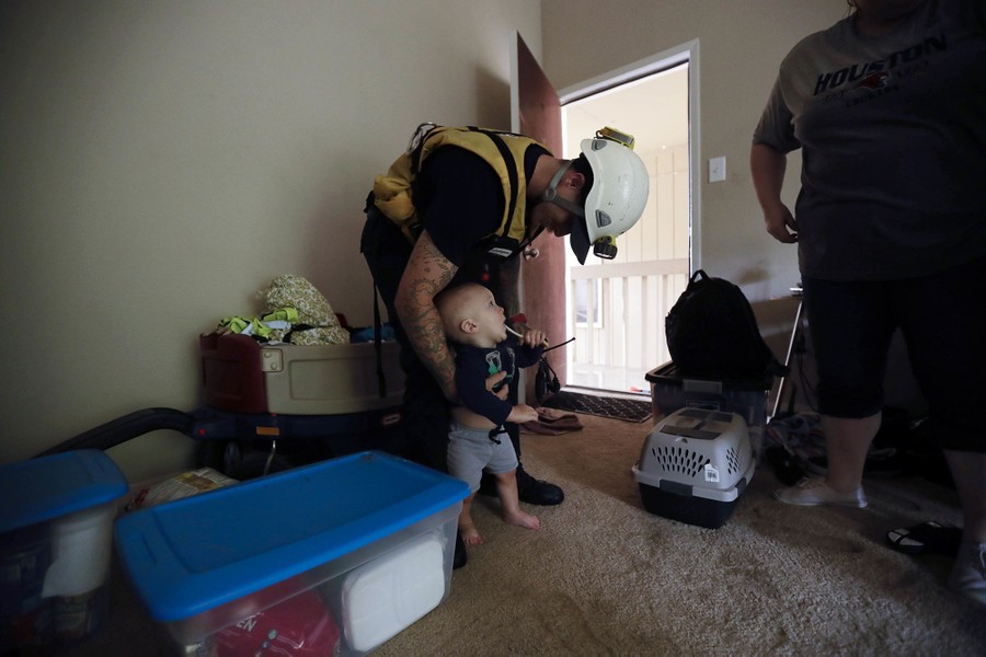 Read moreSteven Sullivan of the Leander Fire Department greets six-month-old Toby Reznor as he helps rescue the Reznor family from their apartment flooded by Tropical Storm Harvey on August 29, 2017, in Kingwood, Texas. #