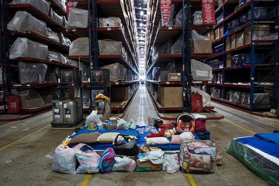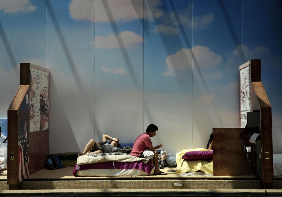 Read moreAlberto Cuevas and his son Eddie rest in their living area at a shelter in Gallery Furniture in Richmond, Texas, on August 30, 2017. Cuevas's family left their Houston home after after an evacuation order was issued for flooding as a result of Hurricane Harvey. The furniture store opened as a shelter, housing as many as 350 people in an area being constructed as a museum of American industry. #