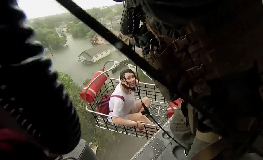 Read moreA woman is rescued from Tropical Storm Harvey floodwaters by a U.S. Navy Helicopter Sea Combat Squadron 7 crew in Beaumont, Texas, in a still image from video made on August 30, 2017. #