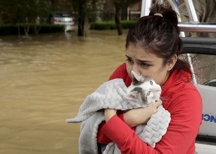 Read moreJannett Martinez holds her cat Gigi as she rides a boat out of her neighborhood, which was inundated after water was released from nearby Addicks Reservoir when it reached capacity due to Tropical Storm Harvey on August 29, 2017, in Houston, Texas. #