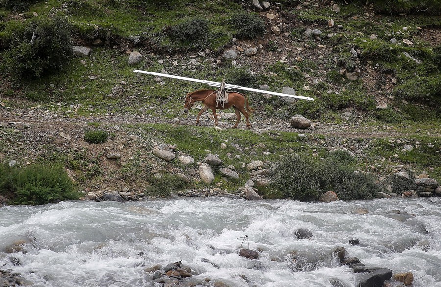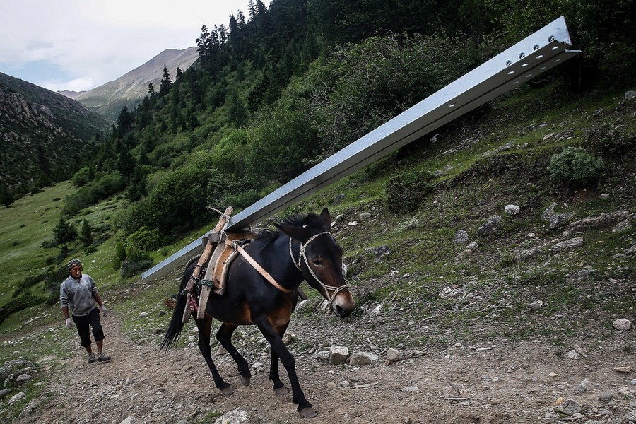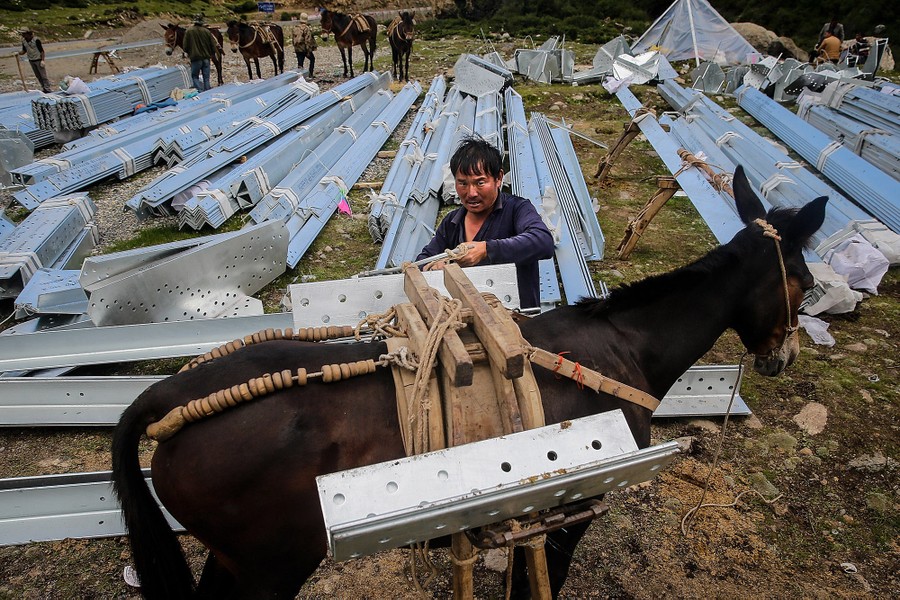 Read moreA mule carrying steel parts for construction of an electric tower is unloaded in Qamdo on July 30, 2017. #