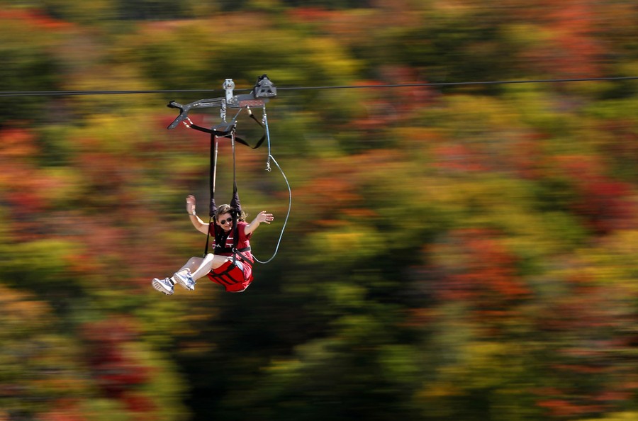 Read moreKatie McWalter of Southborough, Massachusetts, sails by the fall foliage while riding the ZipRider at Wildcat Mountain in Pinkham Notch, New Hampshire, on September 23, 2017. #
