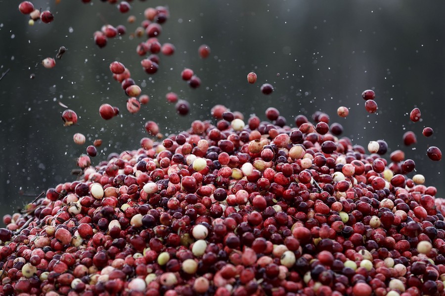 Read moreCranberries harvested at a state farm in the village of Selishche, some 320 km (200 miles) southwest of Minsk, on October 4, 2017. Workers flood the area where the cranberries grow, then use special appliances to loosen them from the vine and let them float to the surface to be harvested. #
