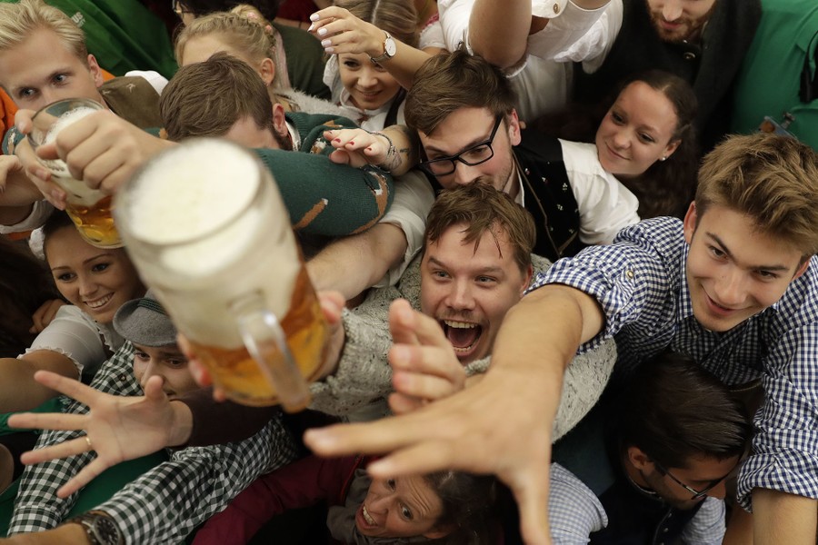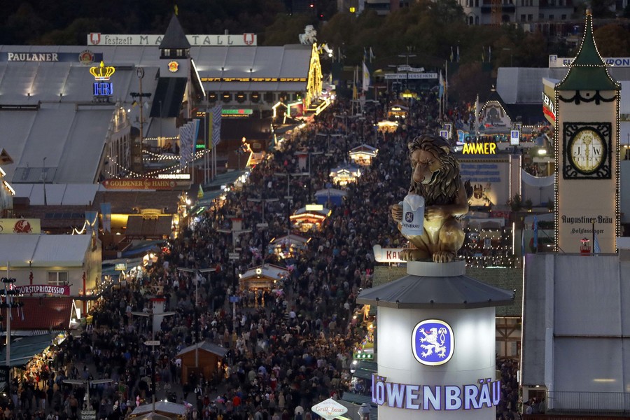 Read moreA drinking lion, the mascot of the Löwenbrauerei brewery sits on a rooftop while people enjoy the last night of the 184th Oktoberfest beer festival in Munich on October 3, 2017. #