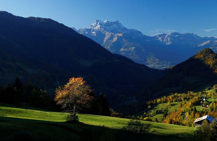 Read moreSunlight illuminates a tree in front of the Dents-du-Midi mountain on an autumn morning in the village of Le Sepey in Ormont-Dessous, Switzerland, on October 14, 2017. #