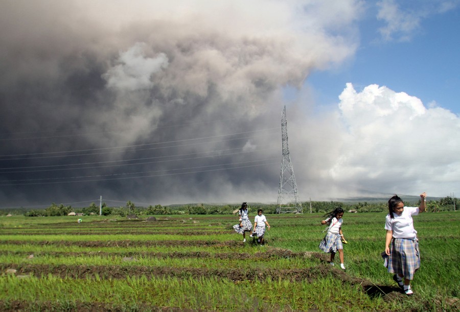 Read moreStudents pass through a rice paddy as they run away from cascading volcanic materials from the slopes of Mayon Volcano in Guinobatan, Albay province, Philippines, on January 22, 2018. #