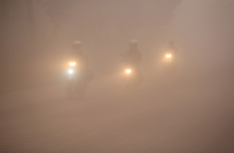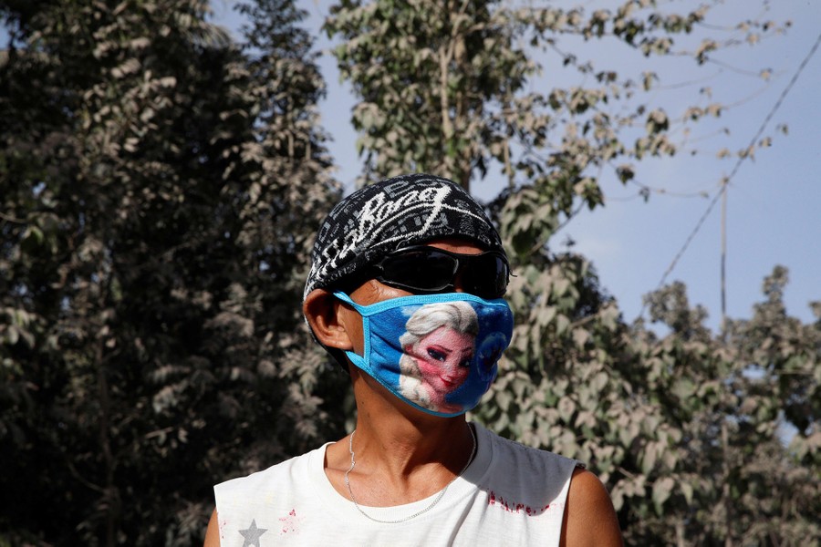 Read moreA couple on motorcycle, their faces covered with masks to protect them from ash, ride on a highway as Mayon volcano continues to erupt as seen from Camalig town on January 25, 2018. #