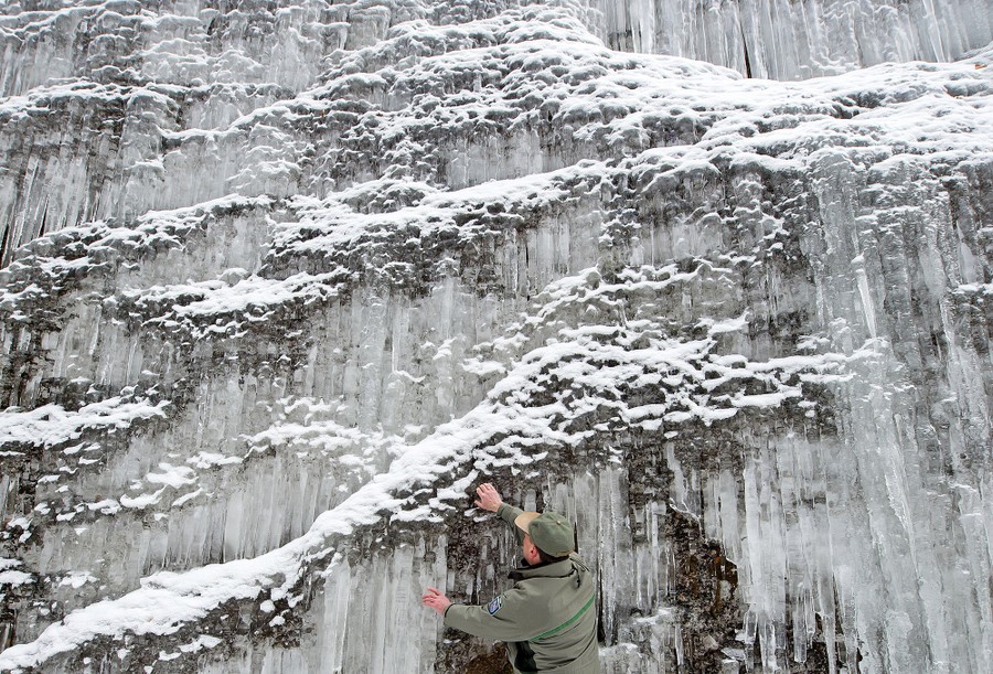 Read moreForest officer Ansgar Pape checks the gigantic icicles and the ice walls during his inspection tour along the Hochwald cave (Hochwaldgrotte) at the Thuringian Forest near Eisenach, Germany, on February 28, 2018. #