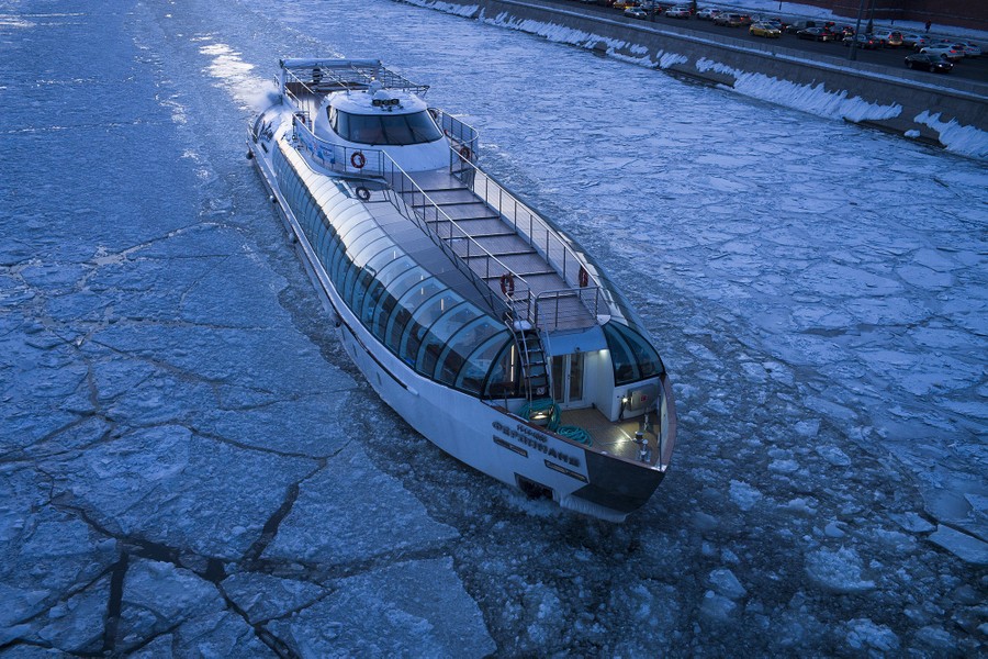 Read moreA tourist boat with a restaurant aboard, specially designed for winter river cruises, moves through the frozen Moskva River in Moscow, Russia, on February 27, 2018. Temperatures dipped to negative 14 degrees Celcius (6.8 Fahrenheit) in Moscow and negative 22 degrees Celcius (negative 7.6 Fahrenheit) at night. #