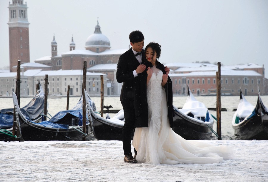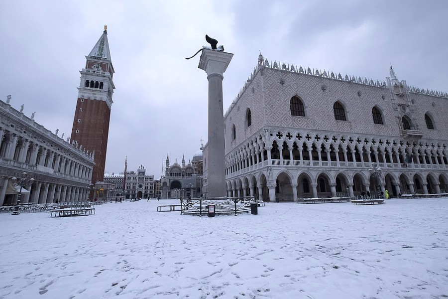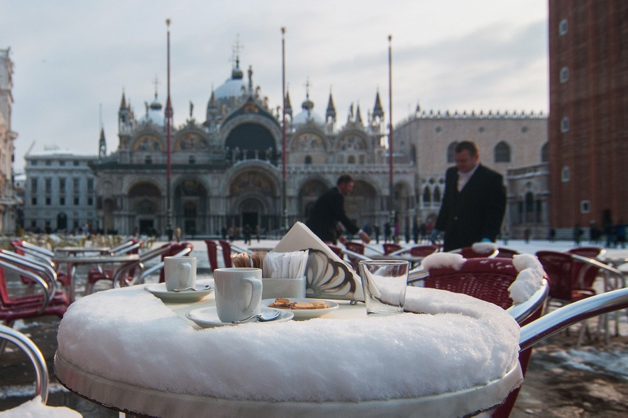 Read moreGondolas covered in snow are moored in Saint Mark's Basin in front of San Giorgio island in Venice, Italy, on February 28, 2018. Venice woke up under a blanket of snow as a Siberian weather front reached Italy. #