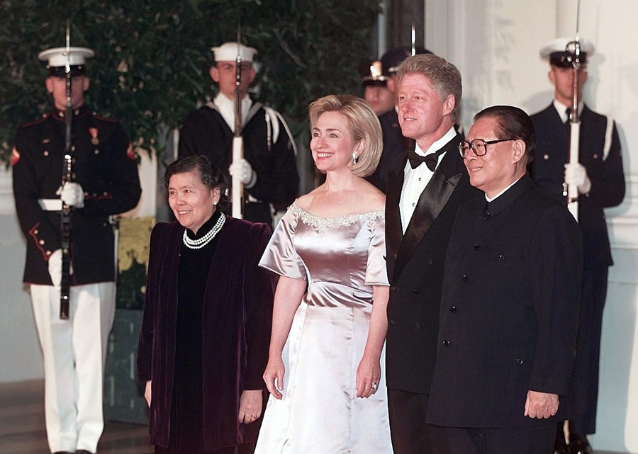 Read morePresident Bill Clinton, First Lady Hillary Clinton, Chinese President Jiang Zemin (right), and Jiang's wife Wang Yeping pose for photographers upon Jiang's arrival at the White House for a state dinner in his honor on October 29, 1997. #
