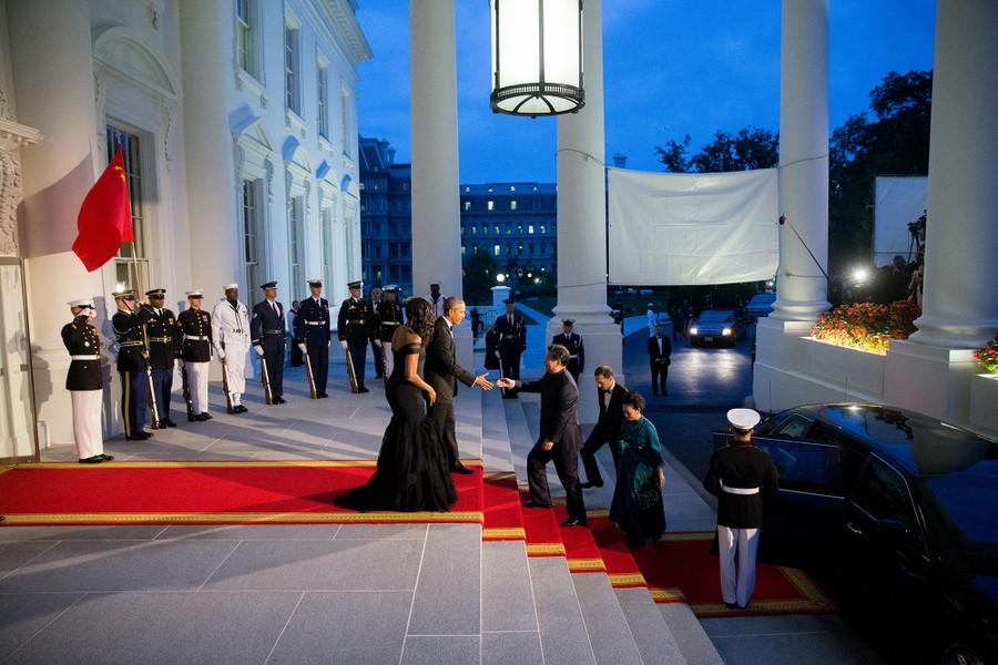 Read morePresident Barack Obama and first lady Michelle Obama greet Chinese President Xi Jinping and his wife Peng Liyuan as they arrive for a state dinner on September 25, 2015, on the North Portico of the White House. #