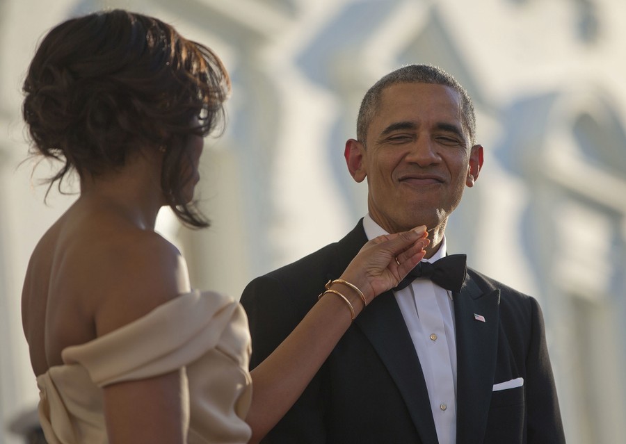 Read moreFirst Lady Michelle Obama touches President Obama's chin as they wait for the arrival of Nordic Leaders on the North Portico for a state dinner at the White House on May 13, 2016. #