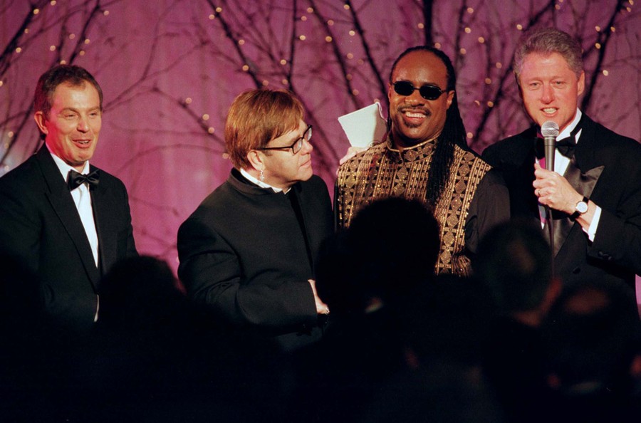 Read moreBritish Prime Minister Tony Blair (left) and U.S. President Bill Clinton (right) thank entertainers Elton John and Stevie Wonder after the duo performed at the White House state dinner hosted by President Clinton, on February 5, 1998. #