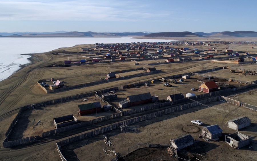 Read moreAn aerial picture of the village of Tsagaannuur alongside Dod Nuur Lake in northern Mongolia on April 23, 2018. Tsagaannuur is the nearest village for reindeer herders living in the forests. It was built during Soviet times to support a fishing collective that also employed many Dukha, until that ceased operation after the collapse of the Soviet economy in the 1990s. #