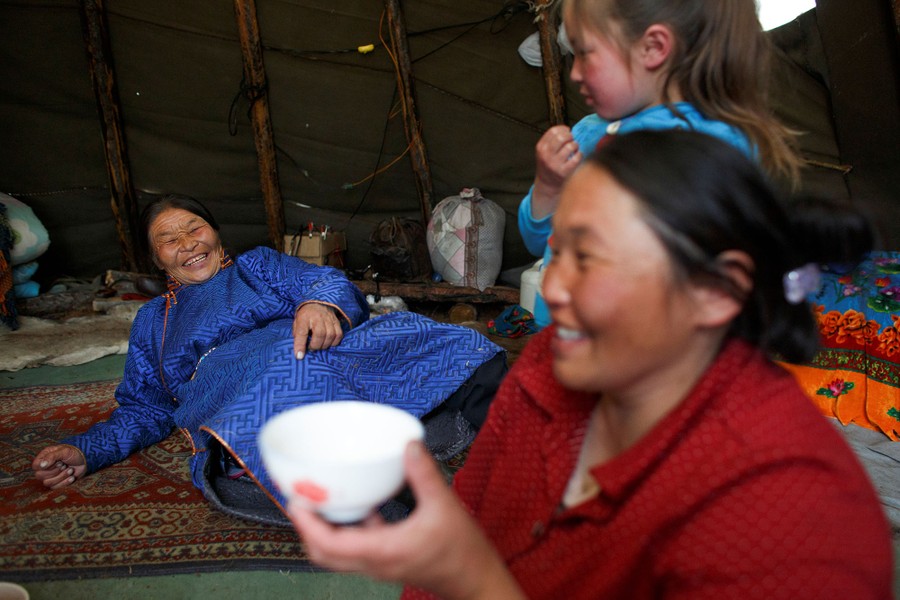 Read moreJargal Gombosed talks with her daughter and granddaughter in their tent on April 20, 2018. "In my day, everything, like rice and flour, were really rare. But now, as long as you have money, you can get anything, any clothes," Gombosed said. "Things were different in the past," she said. "When I was young we didn't have any such thing as a phone, so you would only hear news when you went down to the village center. But now people have phones and also TVs." #