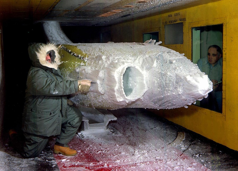 Read moreA researcher examines the ice build-up on a turboprop engine nacelle in the icing research tunnel in 1983. The nacelle was mounted on its side to center its inlet in the optimum cloud field. The curved exhaust duct draws air into the inlet to ensure the proper flow into and around it. #