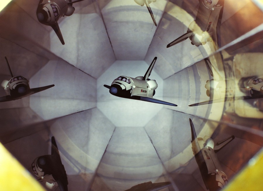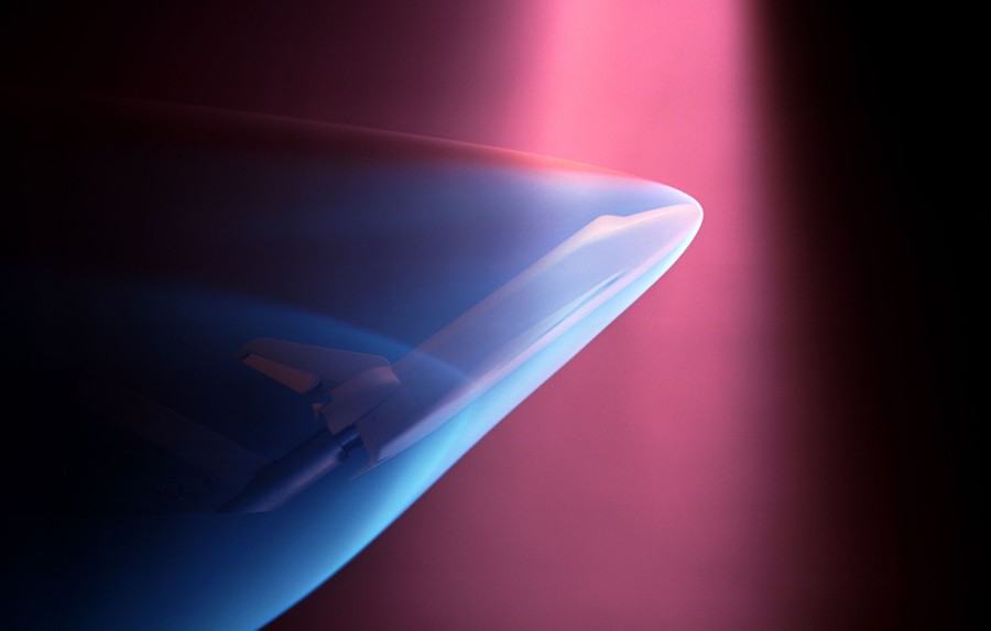 Read moreA Space Shuttle model is magnetically suspended in the transparent hexagonal test section of the MIT/NASA Langley 6-inch magnetic suspension and balance system on June 11, 1991. The low-speed (Mach 0.5) wind tunnel was handcrafted from mahogany. Aerodynamic forces on the test model are measured by the proportional electrical current used to hold the model in place. The system was built by MIT in the late sixties, and was relocated to Langley in the mid-eighties. #