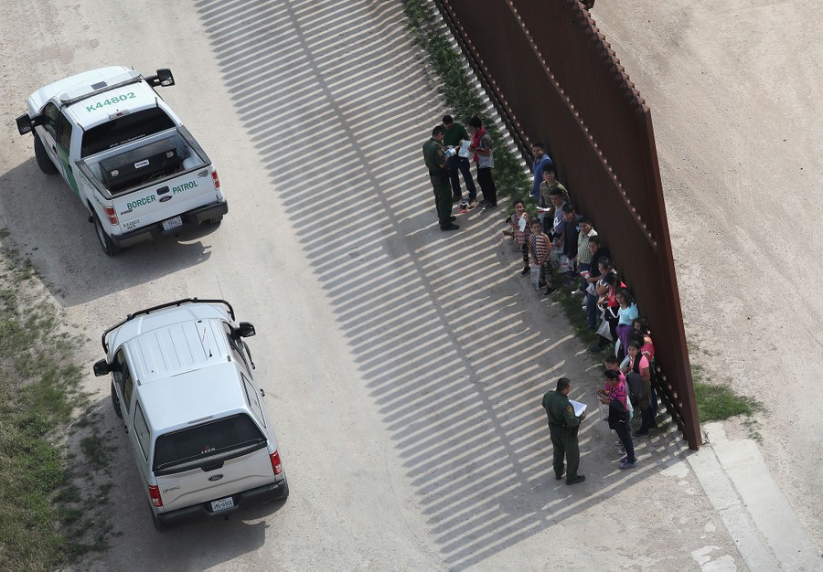 Read moreU.S. Border Patrol agents question undocumented immigrant families at the U.S.-Mexico border fence while taking them into custody on February 21, 2018, near McAllen, Texas. A group of men, women, and children from Central America were picked up after crossing the Rio Grande into Texas, seeking political asylum in the United States. #