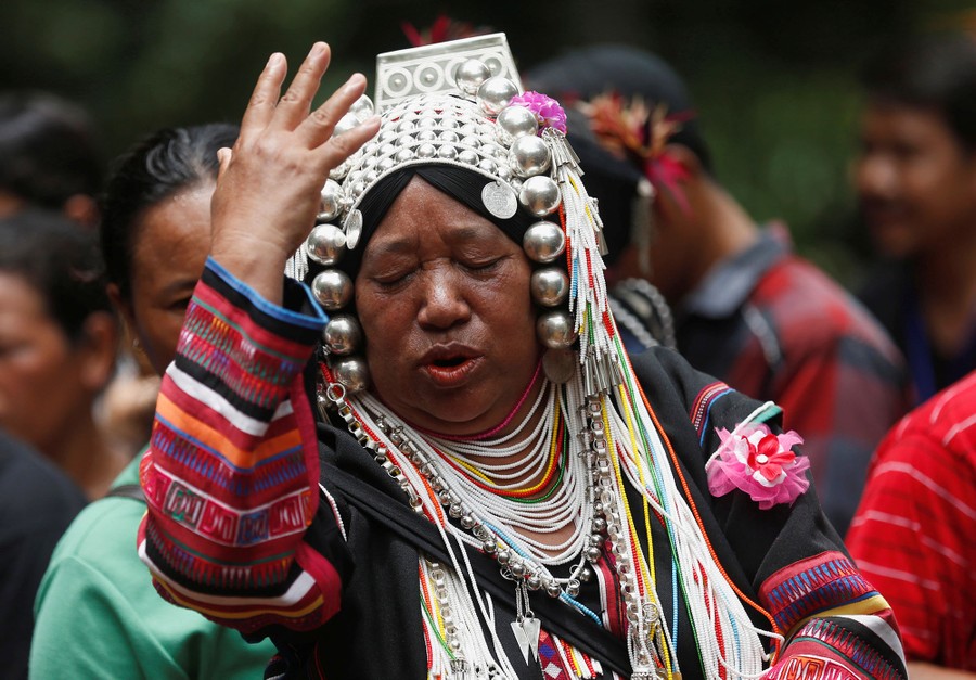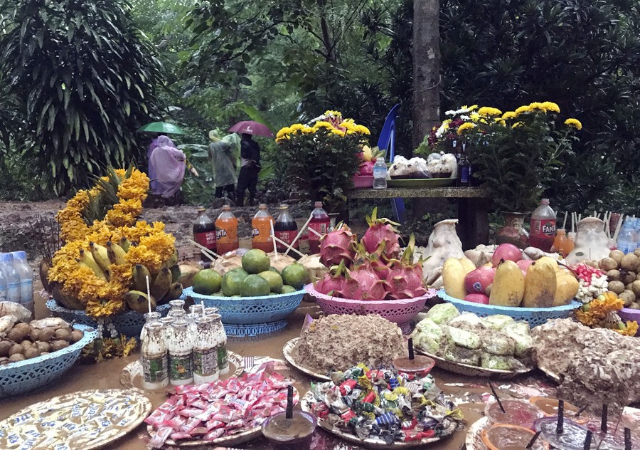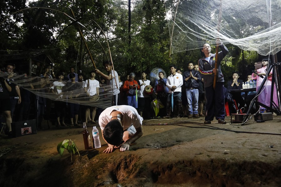 Read moreFamily members and relatives pray at the entrance of Tham Luang cave in Khun Nam Nang Non Forest Park on June 26, 2018. Some hold fishing nets to symbolically fish out lost spirits inside the cave, as others perform a ritual calling to the missing. #