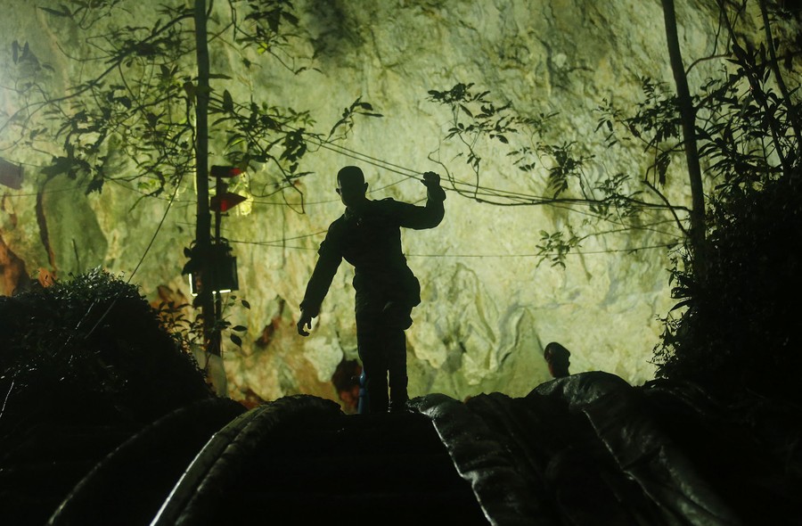Read moreA rescuer makes his way down at the entrance to a cave complex where 12 boys and their soccer coach went missing, in Mae Sai, Chiang Rai province, in northern Thailand, on July 2, 2018. #