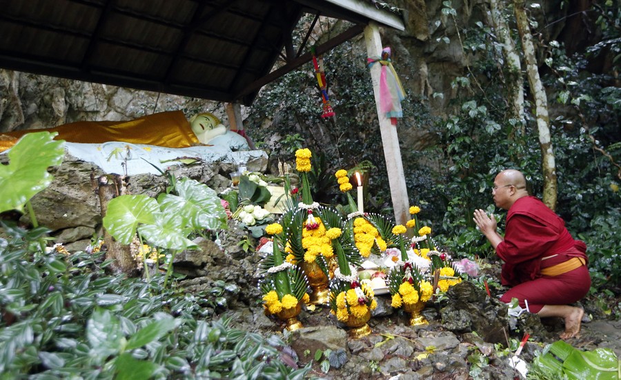 Read moreFamily members and relatives pray at the entrance of Tham Luang cave while rescue personnel conduct operations at the cave in Khun Nam Nang Non Forest Park on June 26, 2018. #