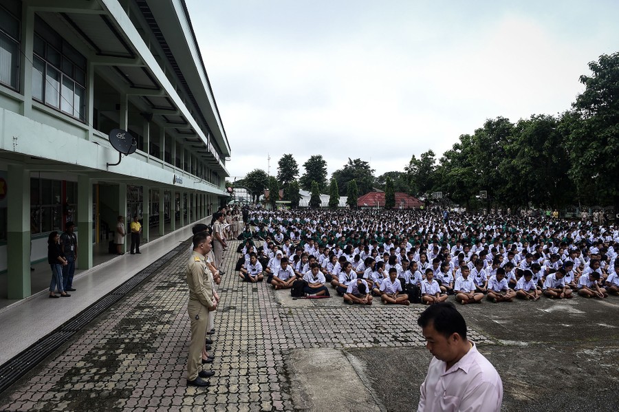Read moreThai school children pray for their missing classmates from the grounds of Mae Sai Prasitsart school, near Tham Luang cave, on July 2, 2018. Classmates spoke of their hopes for a miracle rescue on July 2, as divers inched through thick mud and water towards an air pocket where the group is believed to be. #