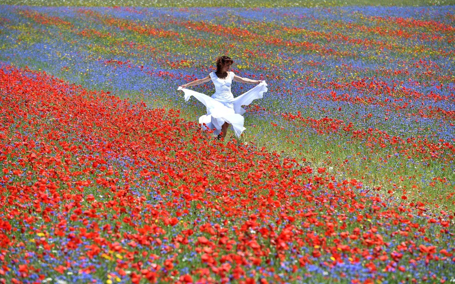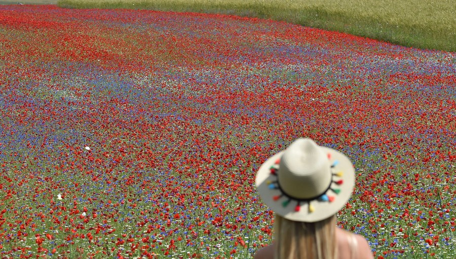 Read moreA woman walks in the middle of flowers in bloom, including lentil fields and poppies, near Castelluccio on July 12, 2016 #