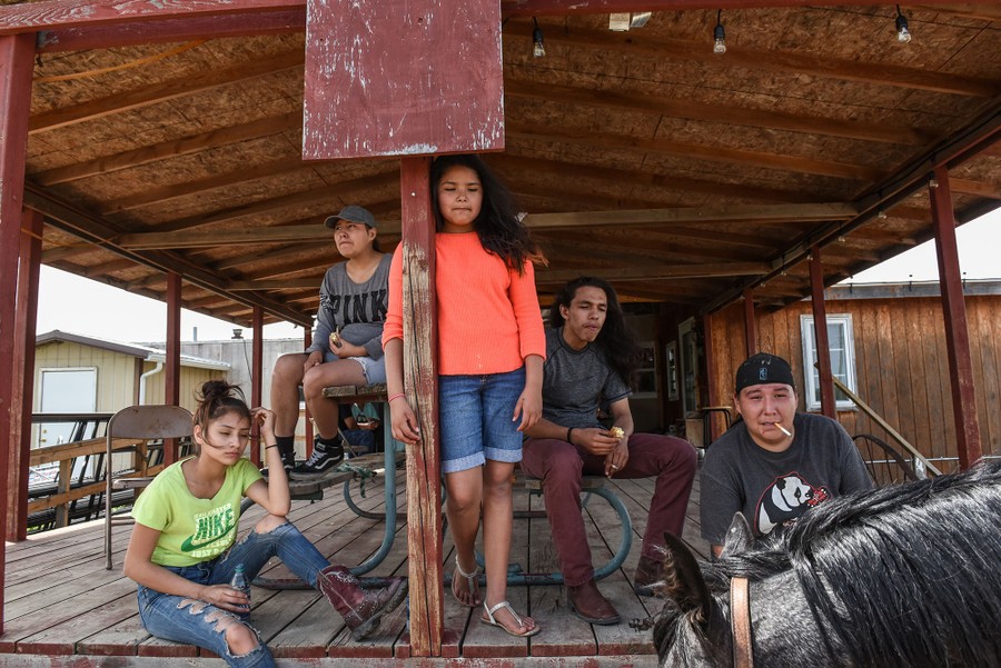 Read moreA group of young people, either part of the Lookinghorse family or affiliated with it, sit on the porch of Arvol Lookinghorse's house on the Cheyenne River Reservation on May 29, 2018. #