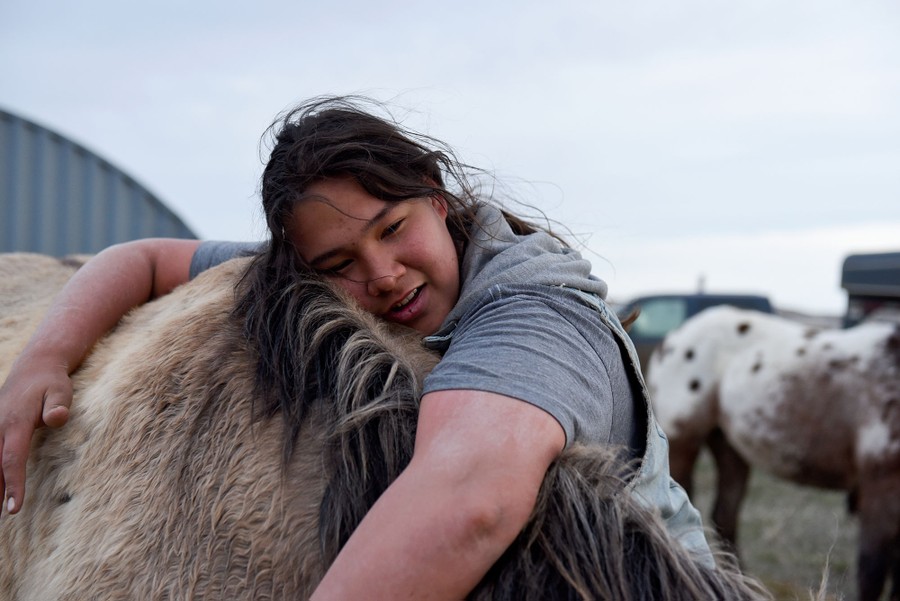 Read moreTatanka Itancan Lone Eagle, 15, from Bridger on the Cheyenne River Reservation, hugs his horse at the end of the day during the Fort Laramie treaty ride in Scenic, South Dakota, on April 19, 2018. #