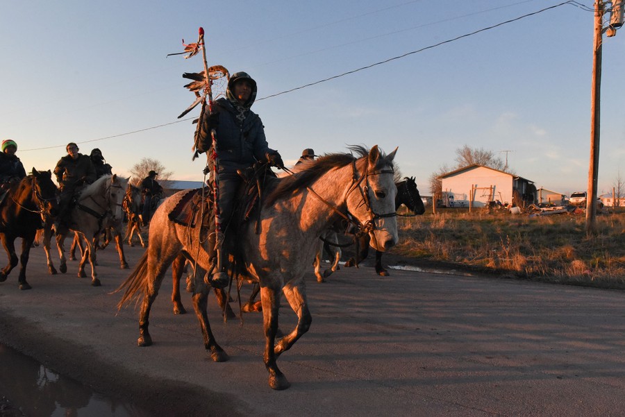 Read moreThe Fort Laramie treaty riders come off the trail and ride past a housing cluster on the Pine Ridge Reservation as the sun sets in Oglala, South Dakota, on April 21, 2018. The forward-most rider carries a sacred staff. Tradition dictates that all the riders ride behind the person carrying the sacred staff. There may be more than one sacred staff, as people might bring a staff to represent their community. #