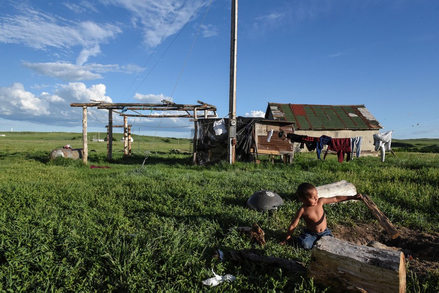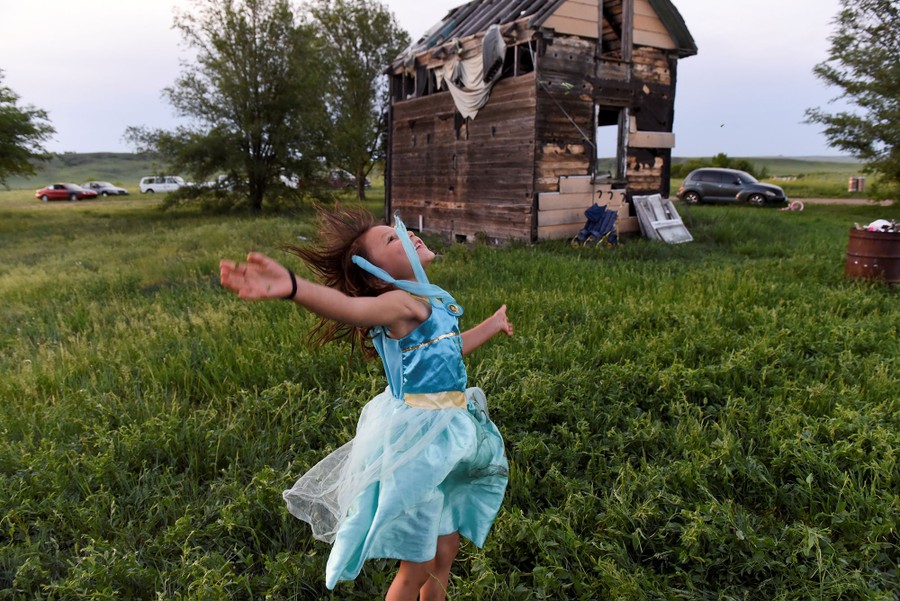 Read moreOne of Beatrice Lookinghorse's granddaughters, Rozelynn Whitebull, plays near an abandoned house in the backyard of Beatrice Lookinghorse's trailer on the Cheyenne River Reservation on May 31, 2018. #