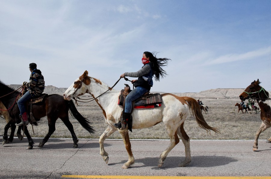 Read moreA group of the Fort Laramie treaty riders head out in the morning along the local highway on the Cheyenne River Reservation outside of Bridger, South Dakota, on April 16, 2018. #
