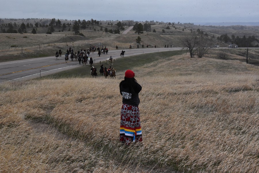 Read moreA woman wearing a sweatshirt that reads "Defend the Sacred" waits for the arrival of the Fort Laramie treaty riders for a rest stop near Harrison, Nebraska, on April 24, 2018. #