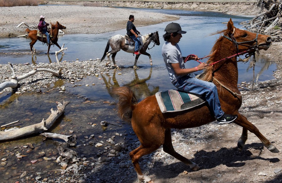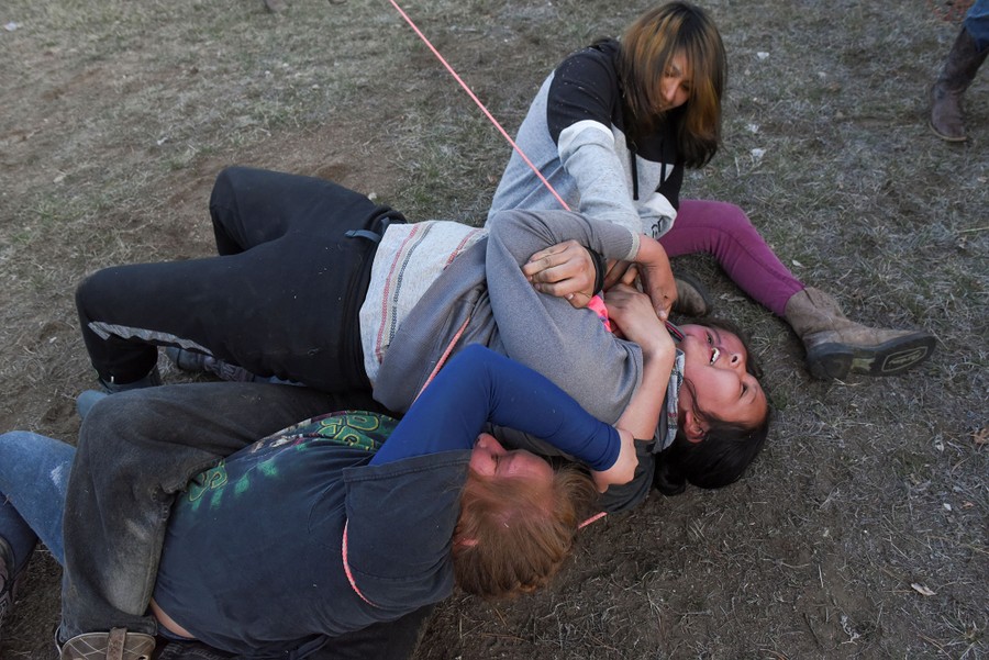 Read moreMaske Ahwe Chu Kinya Plenty Chief, 14, from Eagle Butte on the Cheyenne River Indian Reservation (top) wrestles with some of the Fort Laramie treaty riders as they play games together in their communal camp in Harrison, Nebraska, on April 24, 2018. #