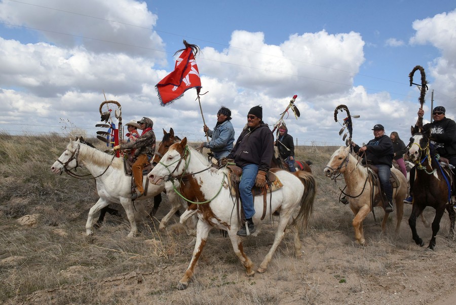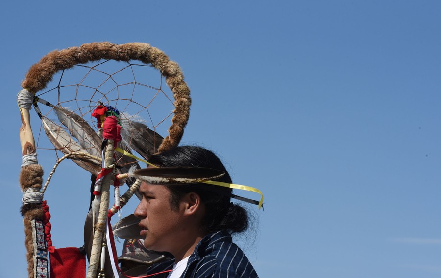 Read moreWes Redday from the Cheyenne River Reservation holds a sacred staff during a morning prayer near an encampment for the Fort Laramie treaty riders in Chadron, Nebraska, on April 23, 2018. #