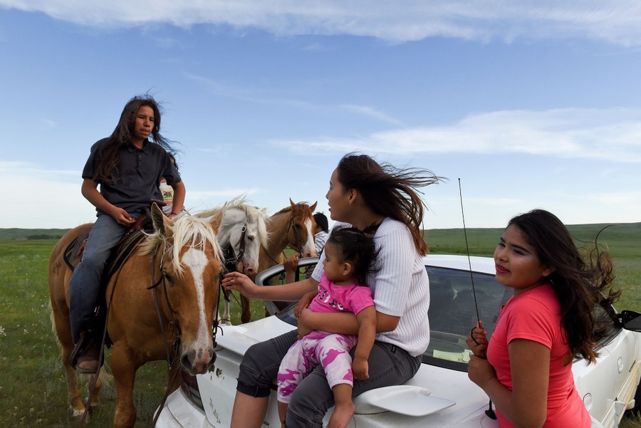 Read moreAngel Rose Lookinghorse, sitting with her younger cousins, Linda Lookinghorse and Maryann Lara, speaks to her brother, Jayden Lookinghorse, riding his horse, on the Cheyenne River Reservation in Green Grass, South Dakota, on May 31, 2018. #