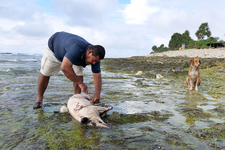Read moreStella Tefiti feeds and cleans the family pigs on August 15, 2018, on Funafuti. Pigs are one of the main sources of fresh meat on the island, and are housed on the ocean side of the main island. #