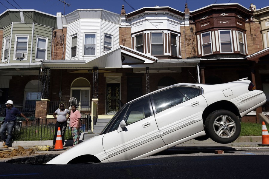 Read moreWomen view a car with its front end in a sinkhole, in Philadelphia, on July 30, 2013. PVI-TV reported that the sinkhole had opened up overnight on a street in the city's Hunting Park section, with no injuries reported. There was no word on what caused the sinkhole. #