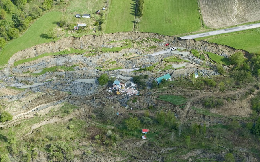 Read moreRescuers work at the scene of a landslide in Saint-Jude, Quebec, as shown from the air on May 11, 2010. A family of four was killed after a sinkhole triggered by the landslide swallowed their house northeast of Montreal. #