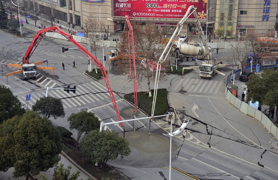 Read moreWorkers use cement to fill in part of a road that caved in in Wuhan, Hubei province, China, on February 11, 2015. No one was injured when the area collapsed due to a fault in the construction of a subway line, local media reported. #