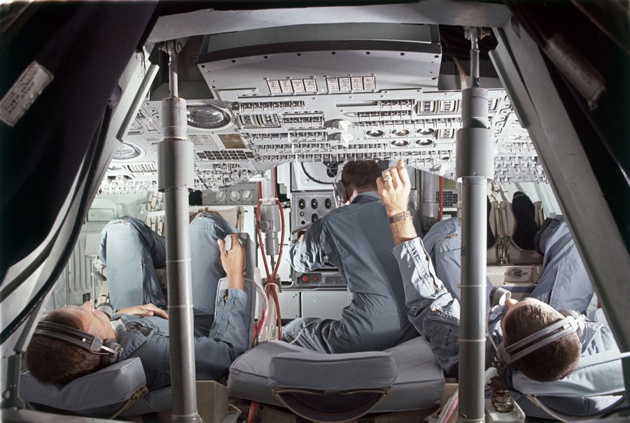 Read moreThe astronaut Frank Borman in the commander’s seat at left, Mike Collins at the controls, middle, and Bill Anders at right during a simulator training session for Apollo 8. #
