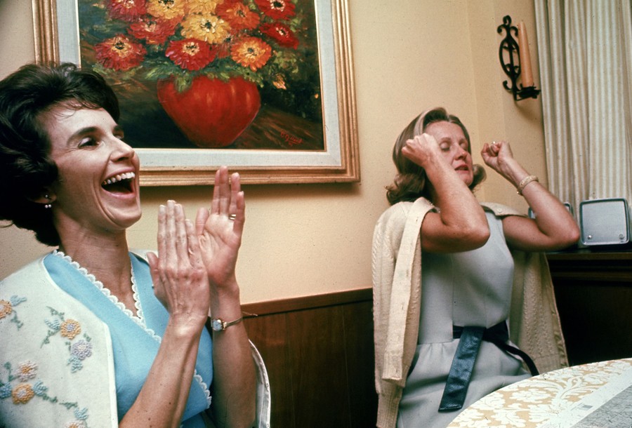 Read moreSitting at a table, Valerie Anders (left) and Sue Borman react with relief after hearing the voices of their astronaut husbands, William Anders and Frank Borman, during their Apollo 8 space flight, in Houston, Texas, in December 1968. #